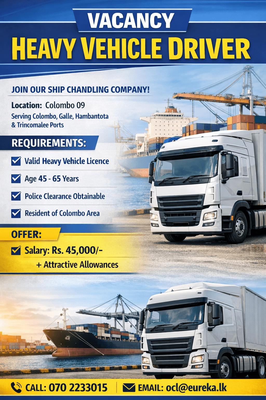 We are a well-established ship chandling company engaged in supplying goods and provisions to vessels calling at major ports in Sri Lanka. As part of operational strengthening, we are looking to onboard a reliable Heavy Vehicle Driver.